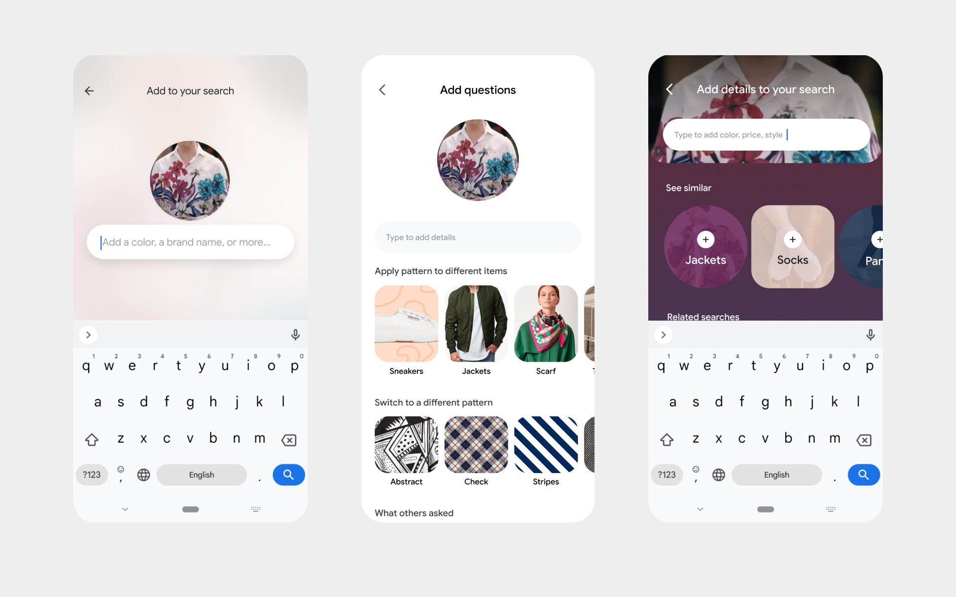 After successful launch of initial multisearch, the team decided to move multimodal core part of Searchbox, this was a challenging task that involves framework convergence, as well as redefining spatial model. We doubled down on the image being your search query, by literally "moving" your image to searchbox when you swipe up to see the result page. This significantly boosted user perception of the feature and became signature interaction for multisearch.