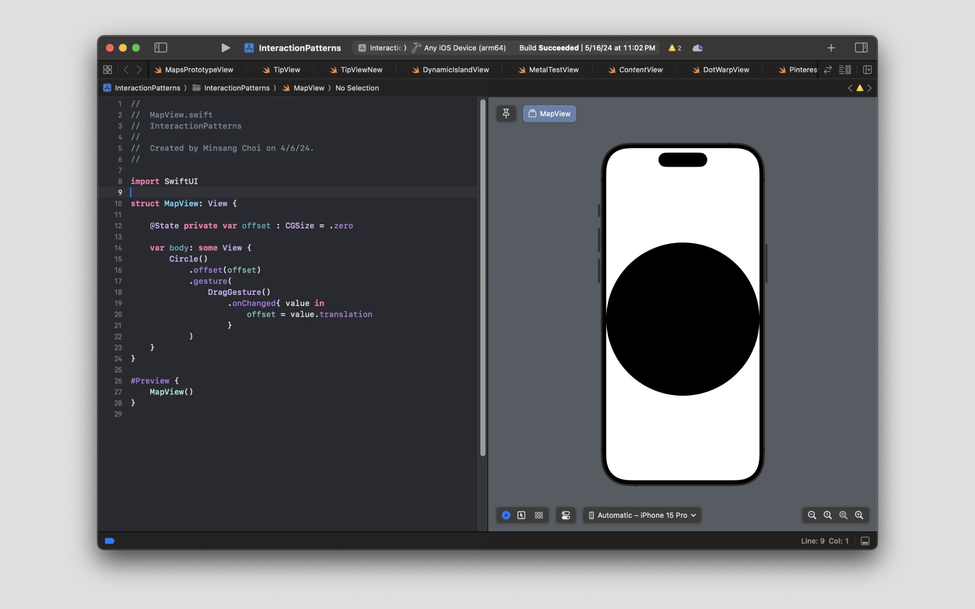 So like I mentioned in the previous article, I really loved how Xcode provides instantaneous feedback in the Canvas. And the first thing that I did was trying to find a way to render something, and make that moving. I'm very used to something like Framer Classic which offered a coffescript based framework that allows you to declare the gesture that you want to detect. So getting to know the way SwiftUI handles gesture wasn't too hard.